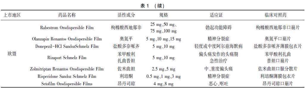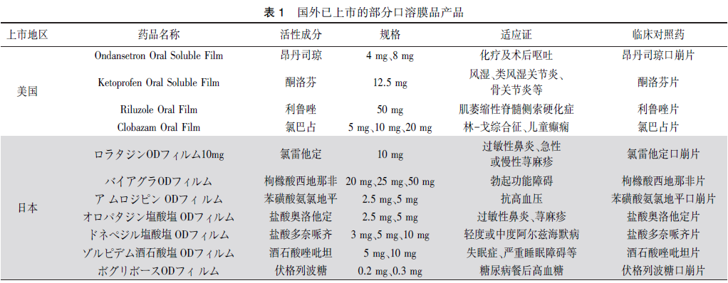 2006年,日本上市了第一個(gè)口溶膜處方藥伏格列波糖口溶膜。2010年,美國(guó)和歐洲分別上市第一個(gè)口溶膜處方藥昂丹司瓊口溶膜(Rapidfilm和Setofilm)。2020年,國(guó)家藥品監(jiān)督管理局批準(zhǔn)了第一個(gè)口溶膜化學(xué)藥品奧氮平口溶膜上市。目前,全球已有多個(gè)口溶膜產(chǎn)品上市,查詢美國(guó)、歐洲、日本藥品監(jiān)管機(jī)構(gòu)網(wǎng)站,部分品種信息見表1。