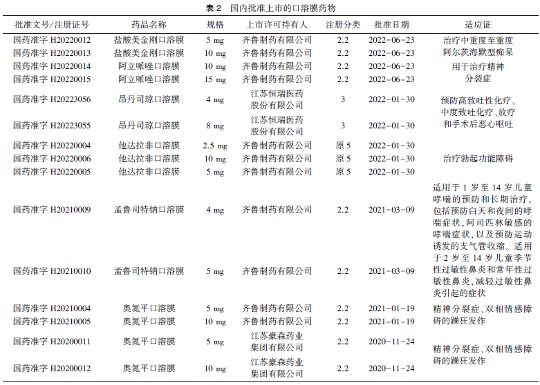 通過國(guó)家藥品監(jiān)督管理局網(wǎng)站查詢,統(tǒng)計(jì)了我國(guó)批準(zhǔn)的口溶膜藥物(見表2),共15個(gè)批準(zhǔn)文號(hào),按照注冊(cè)分類統(tǒng)計(jì),其中10個(gè)為2.2類改良型新藥,占大多數(shù);按適應(yīng)證統(tǒng)計(jì),其中6個(gè)為精神障礙疾病藥物、3個(gè)為生殖系統(tǒng)疾病藥物、2個(gè)為精神神經(jīng)系統(tǒng)藥物、2個(gè)為呼吸系統(tǒng)疾病及抗過敏藥物、2個(gè)消化道及代謝藥物。