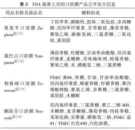 調(diào)研美國(guó)食品藥品監(jiān)督管理局(Food and Drug Administration,F(xiàn)DA)批準(zhǔn)上市的口溶膜處方如表3所示。其中羥丙甲纖維素、羥丙基纖維素為常用的成膜材料,甘油、甘油單油酸酯為常用的增塑劑,三氯蔗糖、香精為常用的矯味劑。