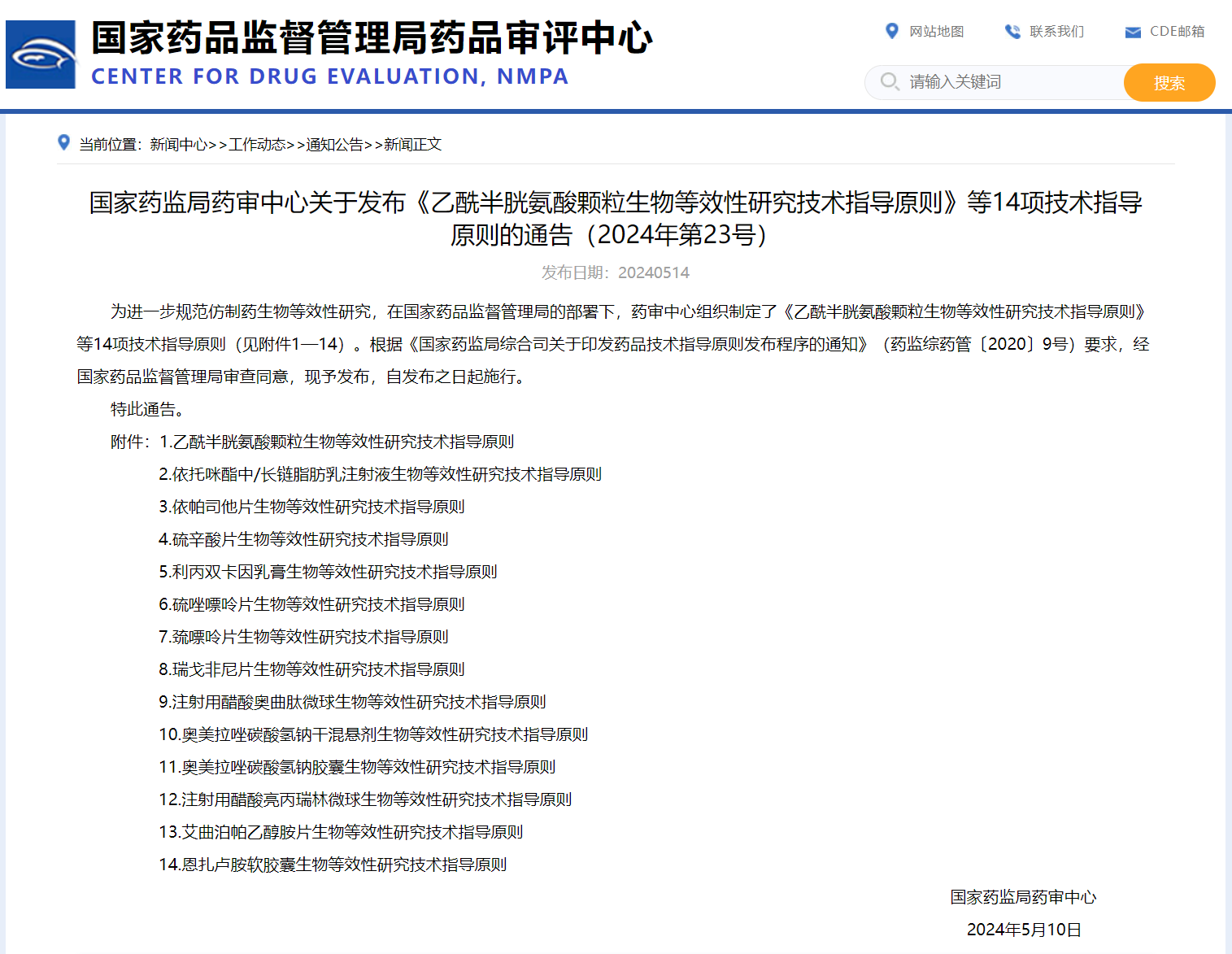 國(guó)家藥監(jiān)局藥審中心關(guān)于發(fā)布《乙酰半胱氨酸顆粒生物等效性研究技術(shù)指導(dǎo)原則》等14項(xiàng)技術(shù)指導(dǎo)原則的通告(2024年第23號(hào))