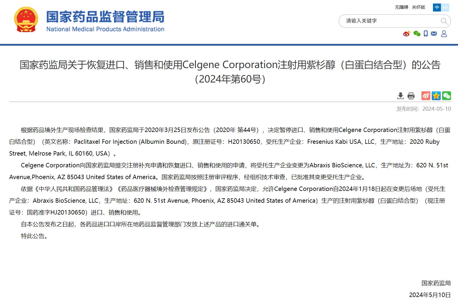 國(guó)家藥監(jiān)局關(guān)于恢復(fù)進(jìn)口、銷售和使用Celgene Corporation注射用紫杉醇(白蛋白結(jié)合型)的公告(2024年第60號(hào))