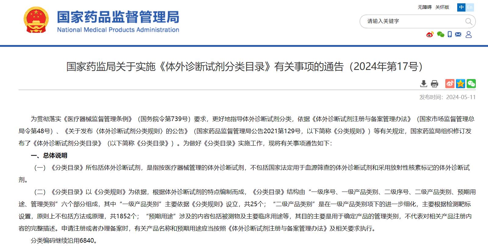 國(guó)家藥監(jiān)局關(guān)于實(shí)施《體外診斷試劑分類目錄》有關(guān)事項(xiàng)的通告(2024年第17號(hào))