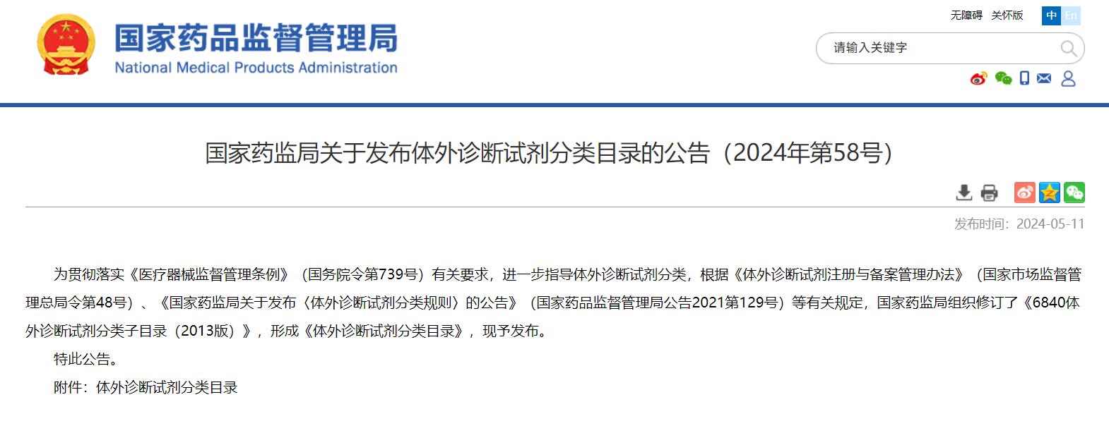 國(guó)家藥監(jiān)局關(guān)于發(fā)布體外診斷試劑分類目錄的公告(2024年第58號(hào))