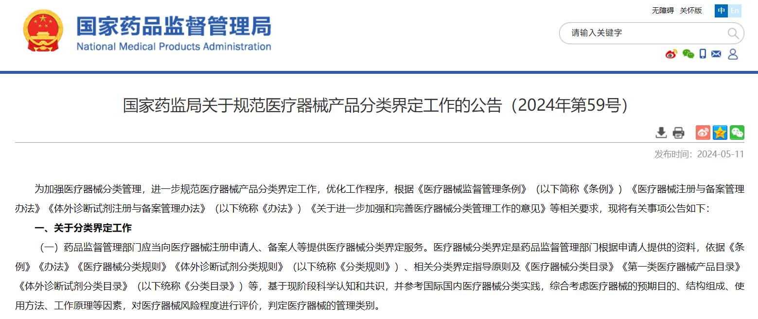 國(guó)家藥監(jiān)局關(guān)于規(guī)范醫(yī)療器械產(chǎn)品分類界定工作的公告(2024年第59號(hào))