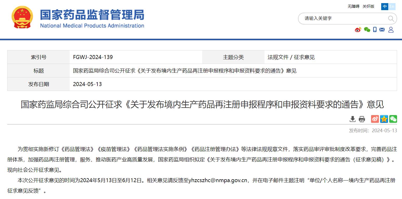 國(guó)家藥監(jiān)局綜合司公開征求《關(guān)于發(fā)布境內(nèi)生產(chǎn)藥品再注冊(cè)申報(bào)程序和申報(bào)資料要求的通告》意見