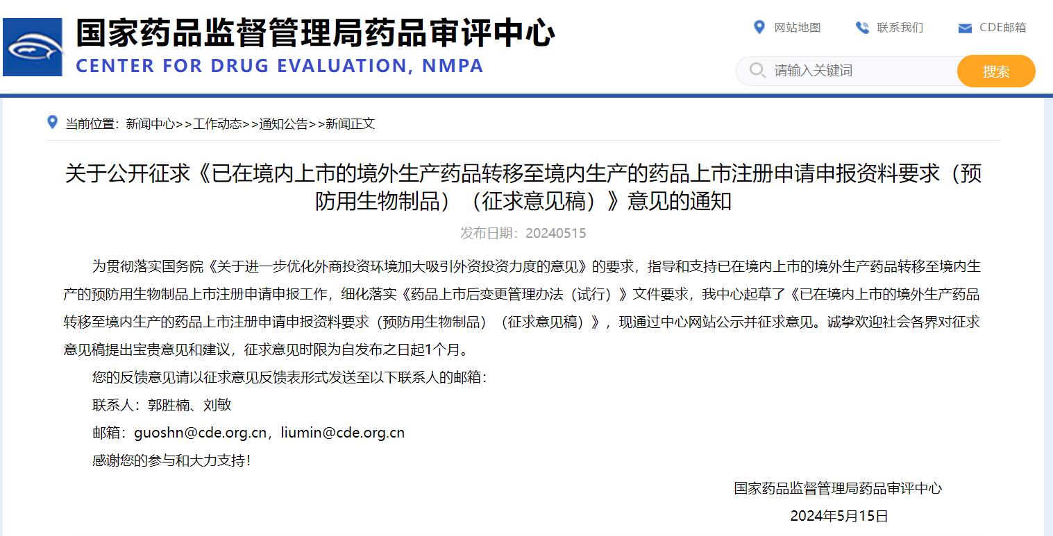 關(guān)于公開征求《已在境內(nèi)上市的境外生產(chǎn)藥品轉(zhuǎn)移至境內(nèi)生產(chǎn)的藥品上市注冊(cè)申請(qǐng)申報(bào)資料要求(預(yù)防用生物制品)(征求意見稿)》意見的通知