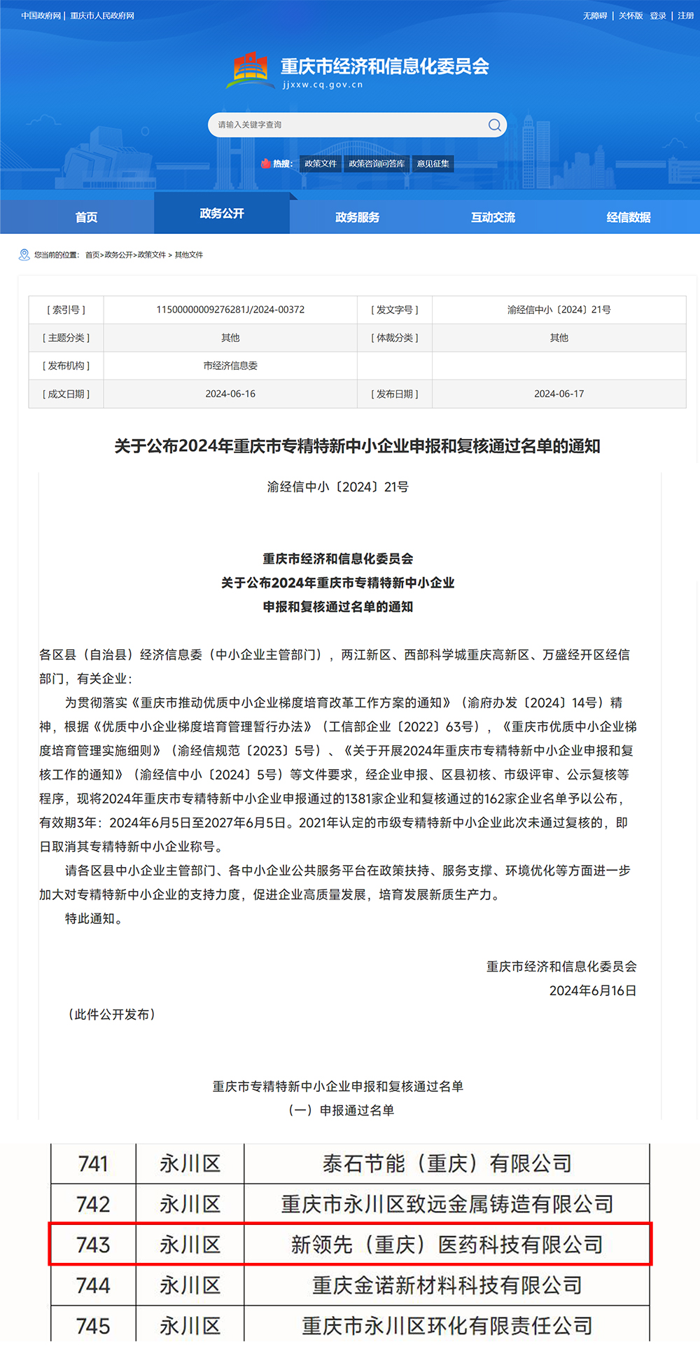 新領先(重慶)醫(yī)藥科技作為第一家落地永川的醫(yī)藥研發(fā)企業(yè),在永川區(qū)委區(qū)政府各級領導的大力支持下,不斷夯實藥學研究基礎,提升技術(shù)水平,已開展研發(fā)項目40余個,其中包含11個改良型新藥項目(獲7個臨床批件),申報專利16項,MAH獲得2個藥品生產(chǎn)許可B證,有近30個高端原料及制劑項目正在實驗室如火如荼地推進。高效完成質(zhì)量體系建設工作,2023年取得了ISO9001質(zhì)量管理體系認證。產(chǎn)學研合作同步進行,與重慶大學藥學院、重慶醫(yī)科大學附屬永川醫(yī)院達成戰(zhàn)略合作,“重慶大學藥學院研究生聯(lián)合培養(yǎng)基地“、”重慶大學藥學院實訓基地”、“重慶大學藥學院大學生創(chuàng)業(yè)基地”、“新領先(重慶)&重慶醫(yī)科大學附屬永川醫(yī)院聯(lián)合研究中心”、“西部職教基地產(chǎn)教聯(lián)合體常務理事單位”等陸續(xù)掛牌。此次新領先(重慶)成功獲評重慶市“專精特新”中小企業(yè),是對公司專業(yè)化水平、創(chuàng)新能力以及發(fā)展?jié)摿Φ恼J可。未來,公司將繼續(xù)秉承“是我讓中國新藥技術(shù)和生產(chǎn)工藝與世界同步”的企業(yè)愿景,不斷加大科研創(chuàng)新投入,突破醫(yī)藥研發(fā)核心技術(shù),全面轉(zhuǎn)型升級,助力新質(zhì)生產(chǎn)力發(fā)展!