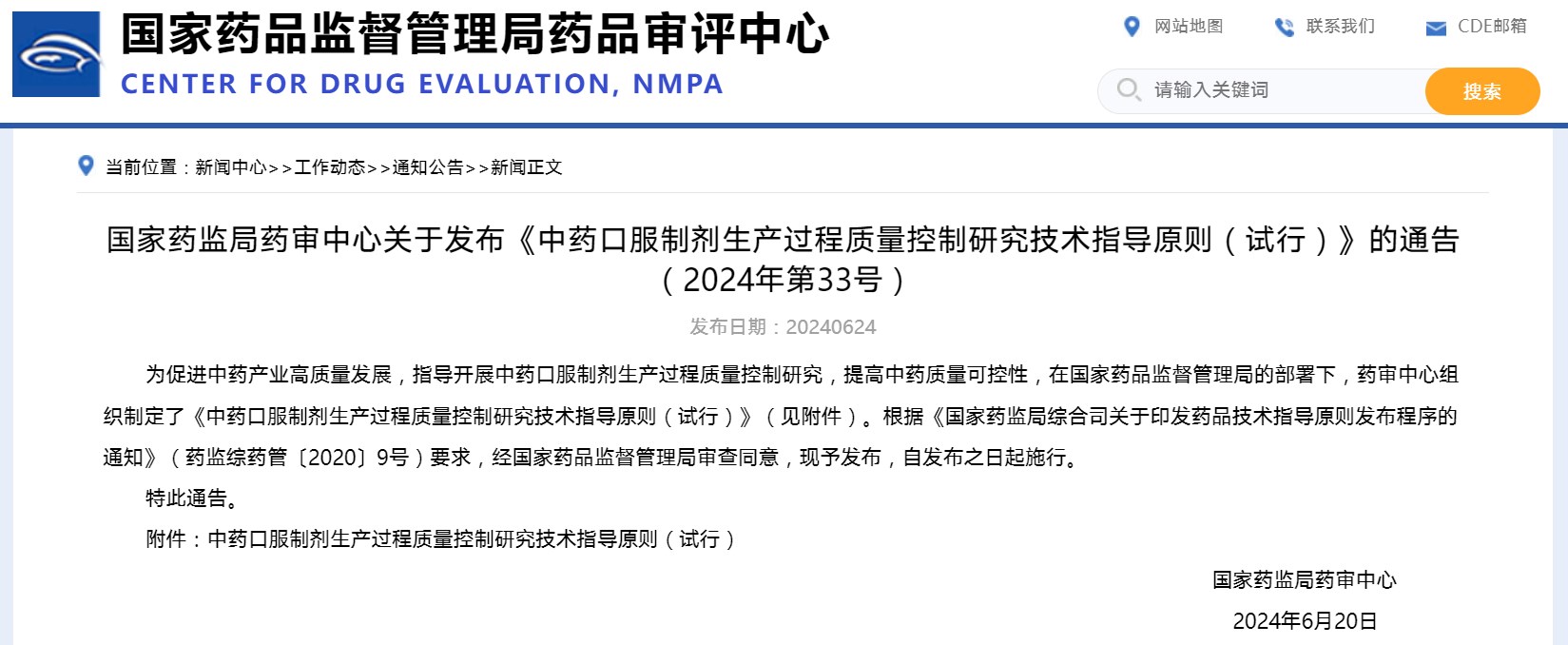 關(guān)于發(fā)布《中藥口服制劑生產(chǎn)過程質(zhì)量控制研究技術(shù)指導(dǎo)原則(試行)》的通告