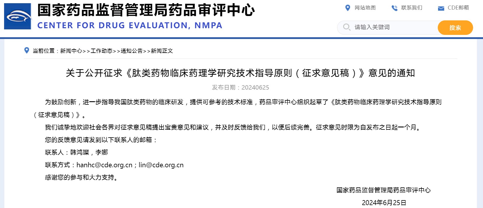 關(guān)于公開征求《肽類藥物臨床藥理學(xué)研究技術(shù)指導(dǎo)原則(征求意見稿)》意見的通知