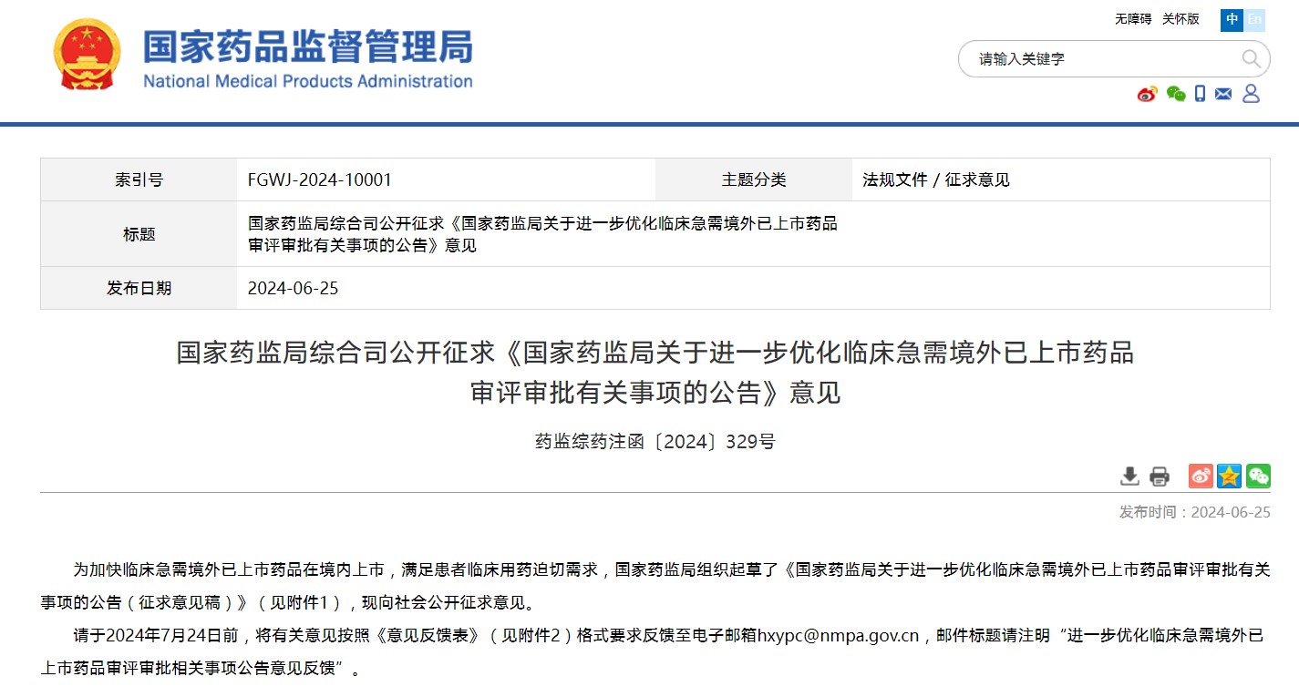 公開征求《國家藥監(jiān)局關(guān)于進一步優(yōu)化臨床急需境外已上市藥品審評審批有關(guān)事項的公告》意見