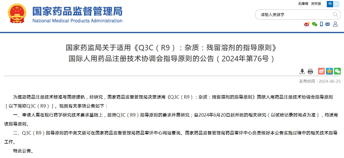 關(guān)于適用《Q3C(R9):雜質(zhì):殘留溶劑的指導(dǎo)原則》國際人用藥品注冊技術(shù)協(xié)調(diào)會指導(dǎo)原則的公告