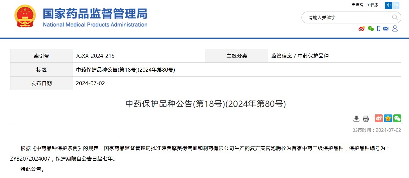 中藥保護(hù)品種公告(第18號(hào))(2024年第80號(hào))