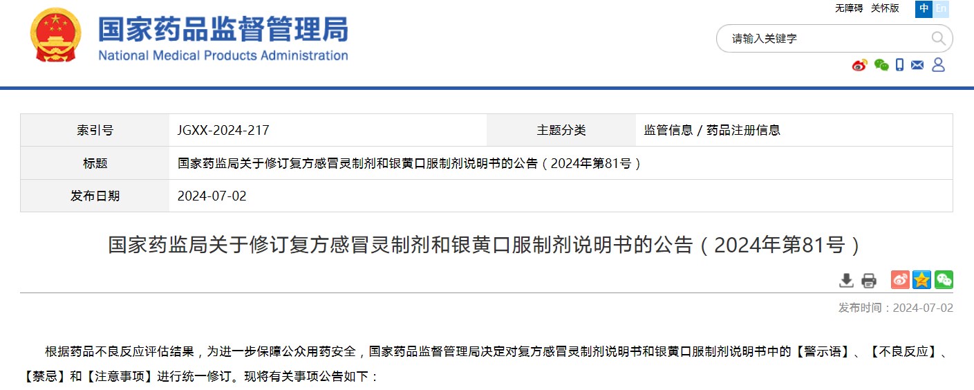國家藥監(jiān)局關(guān)于修訂復(fù)方感冒靈制劑和銀黃口服制劑說明書的公告(2024年第81號(hào))