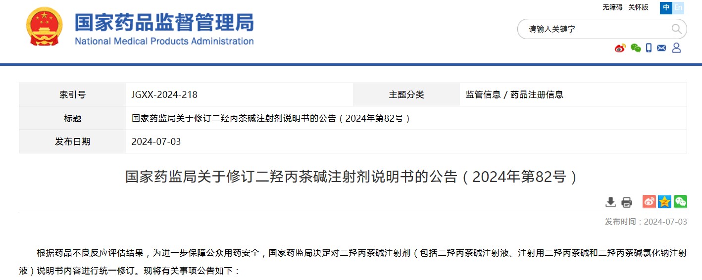 國家藥監(jiān)局關(guān)于修訂二羥丙茶堿注射劑說明書的公告(2024年第82號(hào))