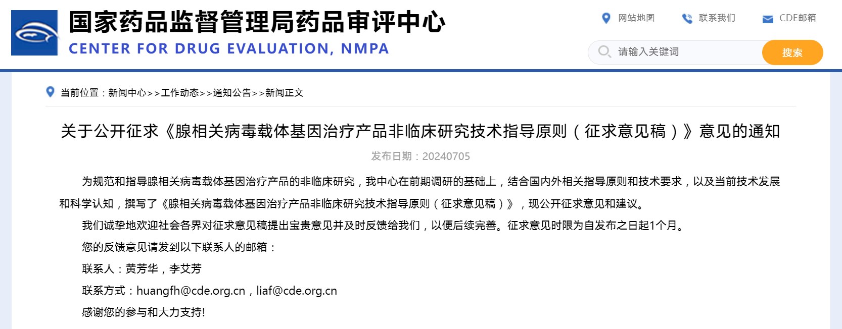 關(guān)于公開征求《腺相關(guān)病毒載體基因治療產(chǎn)品非臨床研究技術(shù)指導(dǎo)原則(征求意見稿)》意見的通知
