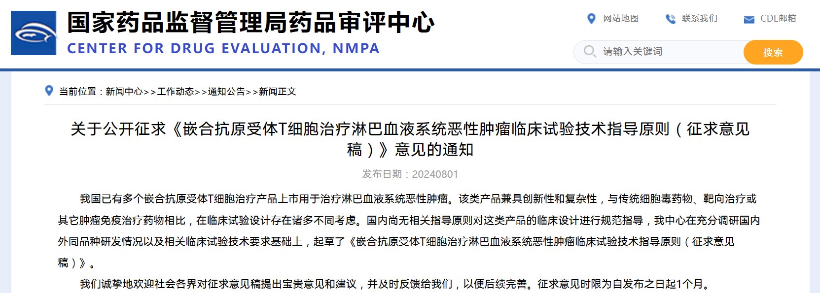 關(guān)于公開征求《嵌合抗原受體T細(xì)胞治療淋巴血液系統(tǒng)惡性腫瘤臨床試驗技術(shù)指導(dǎo)原則(征求意見稿)》意見的通知