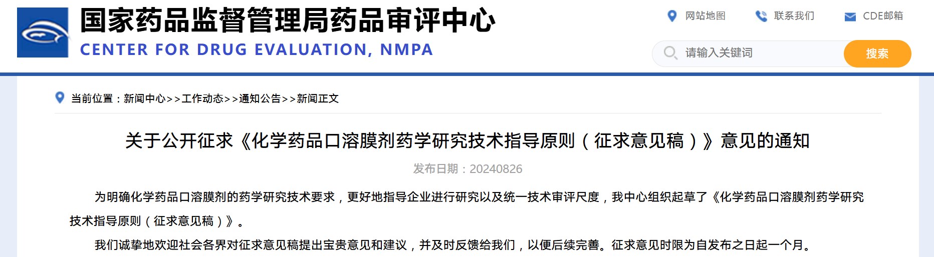 國(guó)家藥監(jiān)局藥審中心關(guān)于公開征求《化學(xué)藥品口溶膜劑藥學(xué)研究技術(shù)指導(dǎo)原則(征求意見稿)》意見的通知