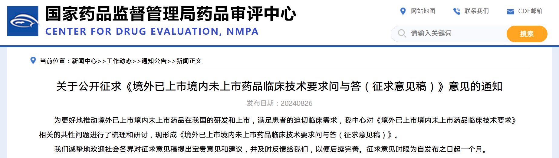 國(guó)家藥監(jiān)局藥審中心關(guān)于公開征求《境外已上市境內(nèi)未上市藥品臨床技術(shù)要求問(wèn)與答(征求意見稿)》意見的通知