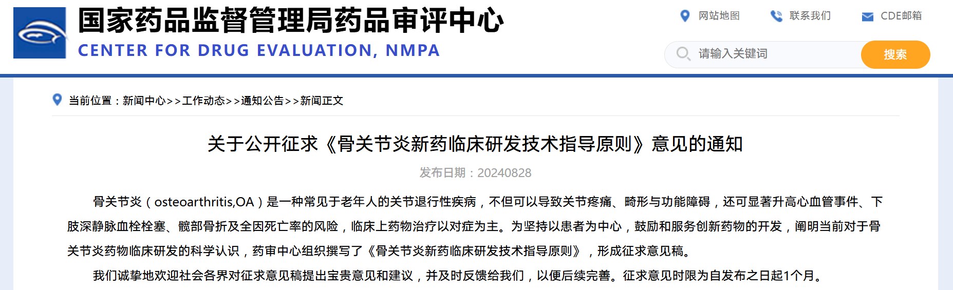 國(guó)家藥監(jiān)局藥審中心關(guān)于公開征求《骨關(guān)節(jié)炎新藥臨床研發(fā)技術(shù)指導(dǎo)原則》意見的通知