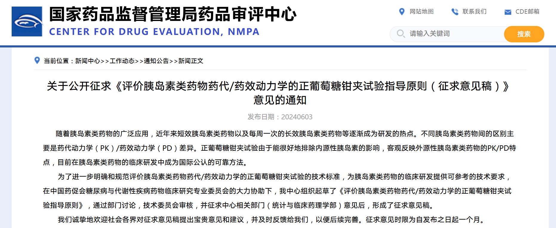 關(guān)于公開征求《評(píng)價(jià)胰島素類藥物藥代/藥效動(dòng)力學(xué)的正葡萄糖鉗夾試驗(yàn)指導(dǎo)原則(征求意見稿)》意見的通知