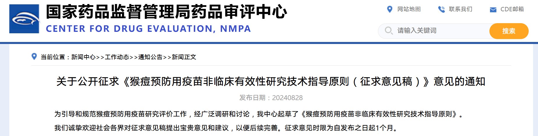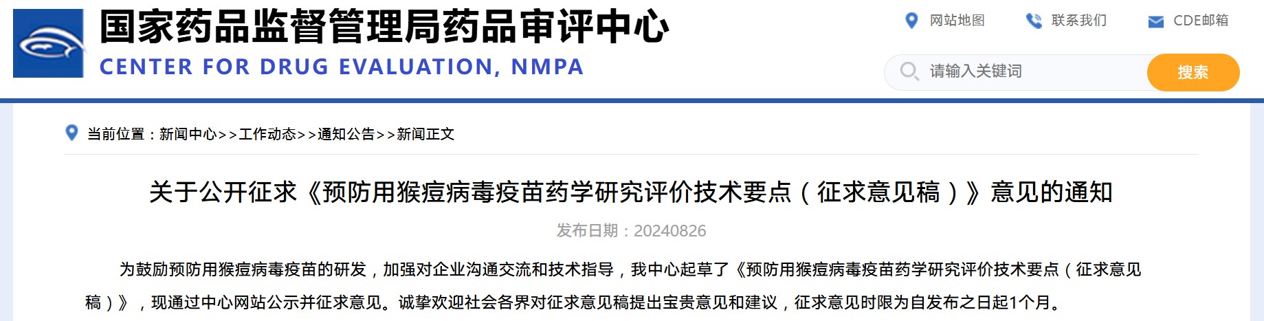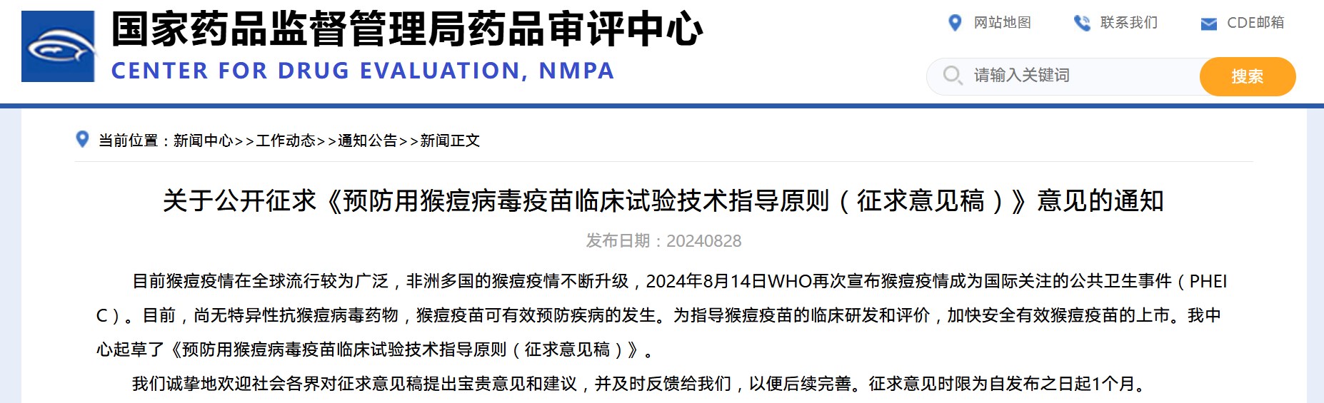 關(guān)于公開征求《預(yù)防用猴痘病毒疫苗藥學(xué)研究評(píng)價(jià)技術(shù)要點(diǎn)(征求意見稿)》意見的通知