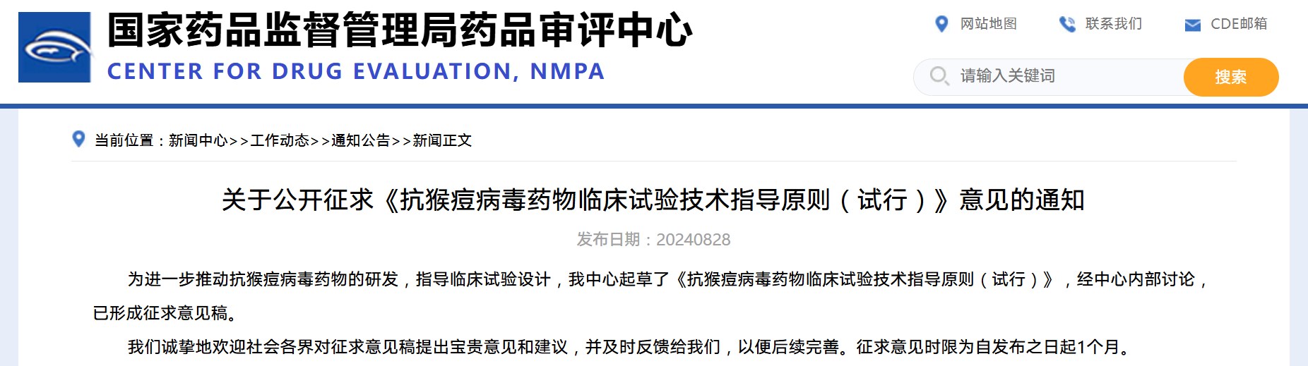 關(guān)于公開征求《抗猴痘病毒藥物臨床試驗(yàn)技術(shù)指導(dǎo)原則(試行)》意見的通知