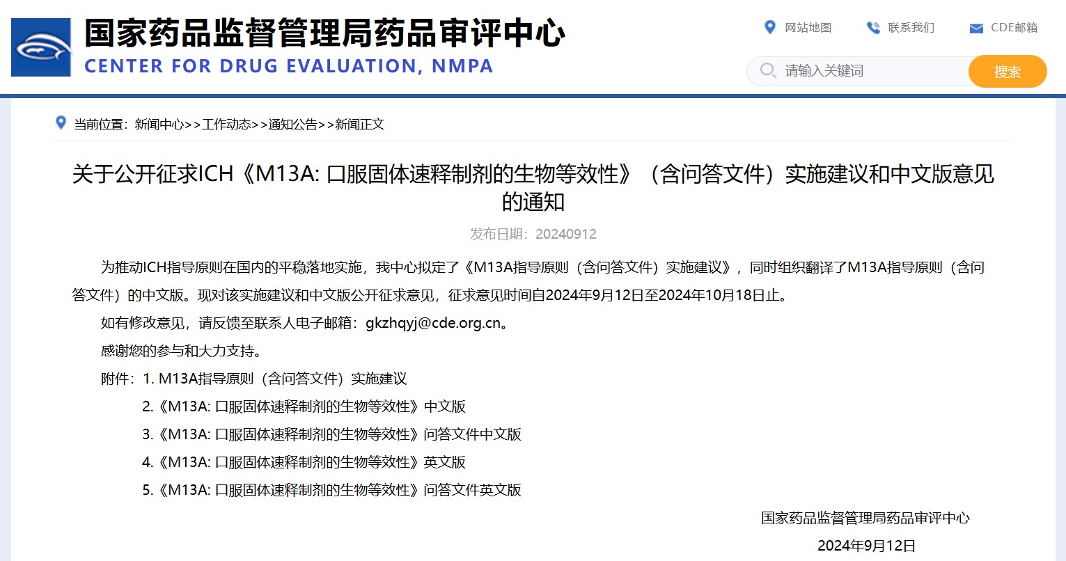 關(guān)于公開征求ICH《M13A: 口服固體速釋制劑的生物等效性》(含問答文件)實(shí)施建議和中文版意見的通知