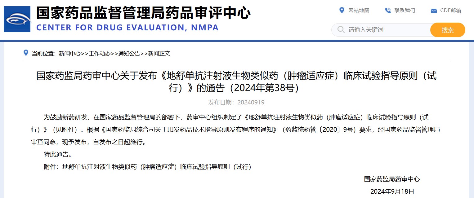 國家藥監(jiān)局藥審中心關(guān)于發(fā)布《地舒單抗注射液生物類似藥(腫瘤適應(yīng)癥)臨床試驗(yàn)指導(dǎo)原則(試行)》的通告(2024年第38號(hào))