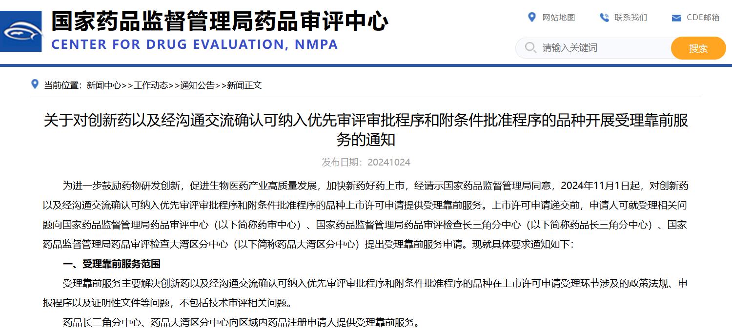 關(guān)于對創(chuàng)新藥以及經(jīng)溝通交流確認可納入優(yōu)先審評審批程序和附條件批準程序的品種開展受理靠前服務(wù)的通知