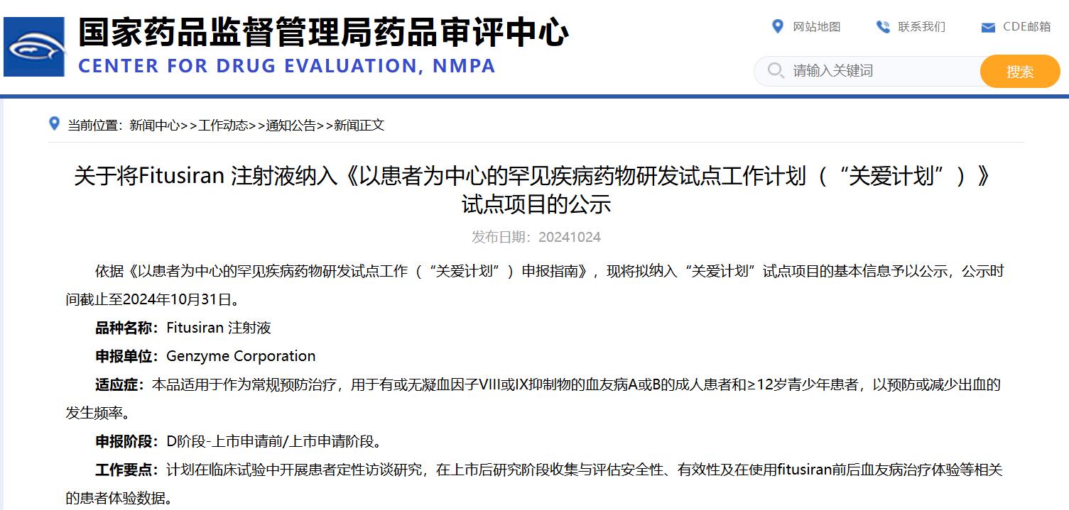 關(guān)于將Fitusiran 注射液納入《以患者為中心的罕見疾病藥物研發(fā)試點工作計劃(“關(guān)愛計劃”)》試點項目的公示
