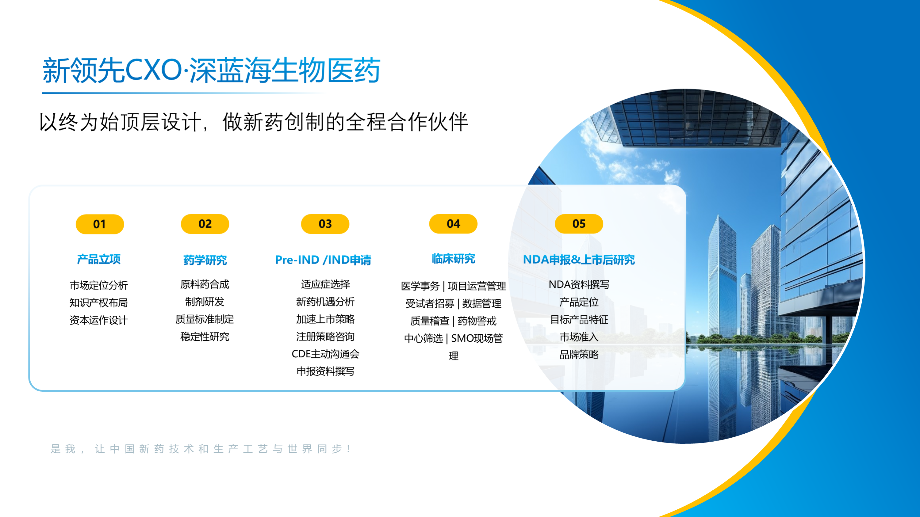 深藍(lán)海生物醫(yī)藥是新領(lǐng)先醫(yī)藥(股票代碼600222)在臨床CRO領(lǐng)域的子品牌,成立于2007年,秉持“以終為始,頂層設(shè)計(jì),做新藥創(chuàng)制的全程合作伙伴”的服務(wù)理念,為全球藥企提供覆蓋生物藥、化藥、中藥、醫(yī)療器械、細(xì)胞與基因治療等I-III期臨床研究、生物等效性研究、上市后研究、第三方稽查、IND和NDA申報(bào)以及醫(yī)學(xué)事務(wù)等服務(wù)??蓾M足不同研發(fā)型企業(yè)的臨床研究定制需求,為國內(nèi)外客戶打通新藥上市前關(guān)鍵瓶頸。
