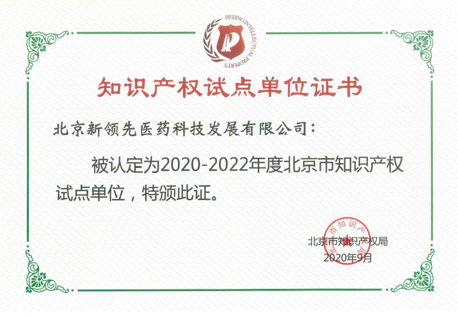 On September 30, 2020, Beijing Leadingpharm Medicine Technology Development Co.,Ltd. was recognized as "Beijing Intellectual Property Pilot Unit" by Beijing Intellectual Property Office.This certification is another honorary qualification related to intellectual property that Leadingpharm has won after successfully passing the intellectual property management system certification in 2019. This is not only the affirmation of Beijing's intellectual property authorities on the new leader's strong R&D capability and intellectual property strategic planning, but also the profound accumulation of Leadingpharm’s intellectual property rights and patented technologies, which has further established Leadingpharm’s leading position in the field of pharmaceutical R&D technical services.