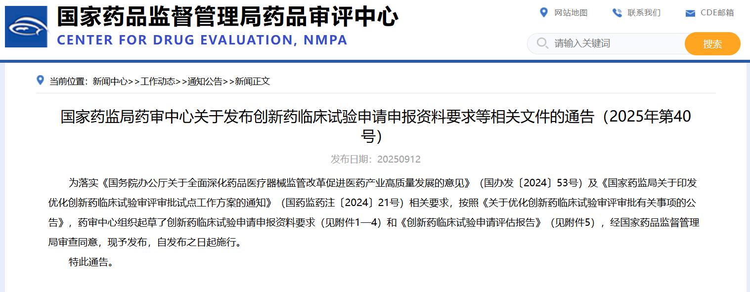 國(guó)家藥監(jiān)局藥審中心關(guān)于發(fā)布創(chuàng)新藥臨床試驗(yàn)申請(qǐng)申報(bào)資料要求等相關(guān)文件的通告(2025年第40號(hào))