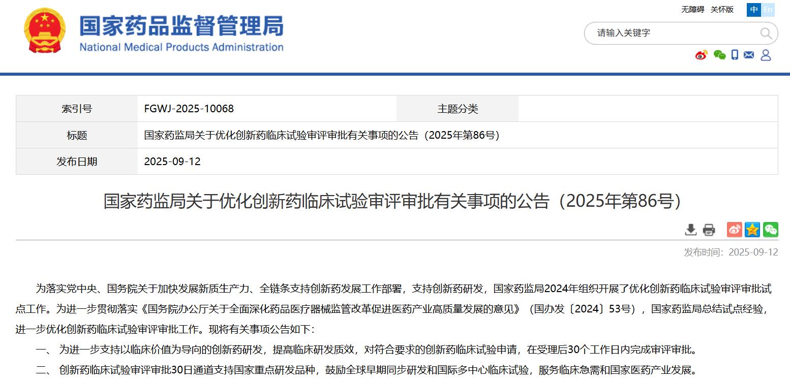 國(guó)家藥監(jiān)局關(guān)于優(yōu)化創(chuàng)新藥臨床試驗(yàn)審評(píng)審批有關(guān)事項(xiàng)的公告(2025年第86號(hào))