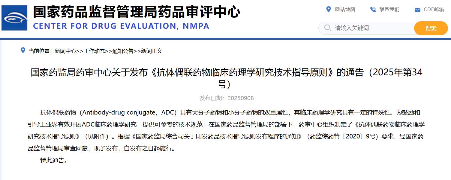 國(guó)家藥監(jiān)局藥審中心關(guān)于發(fā)布《抗體偶聯(lián)藥物臨床藥理學(xué)研究技術(shù)指導(dǎo)原則》的通告(2025年第34號(hào))