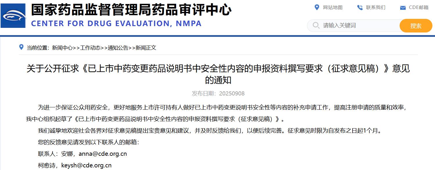 關(guān)于公開(kāi)征求《已上市中藥變更藥品說(shuō)明書(shū)中安全性?xún)?nèi)容的申報(bào)資料撰寫(xiě)要求(征求意見(jiàn)稿)》意見(jiàn)的通知
