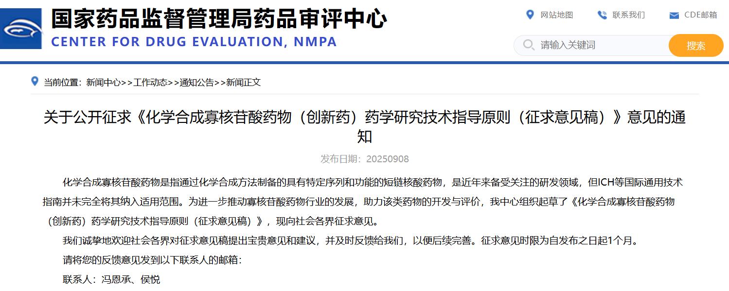 關(guān)于公開(kāi)征求《化學(xué)合成寡核苷酸藥物(創(chuàng)新藥)藥學(xué)研究技術(shù)指導(dǎo)原則(征求意見(jiàn)稿)》意見(jiàn)的通知