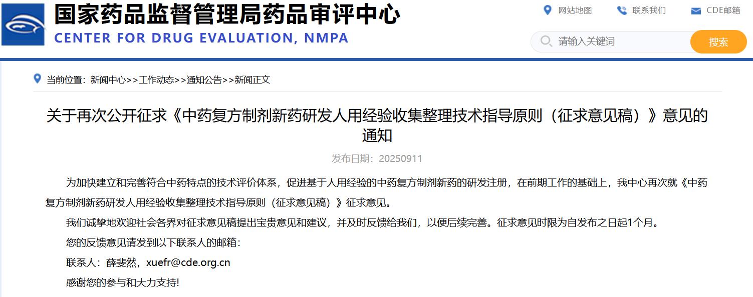 關(guān)于再次公開(kāi)征求《中藥復(fù)方制劑新藥研發(fā)人用經(jīng)驗(yàn)收集整理技術(shù)指導(dǎo)原則(征求意見(jiàn)稿)》意見(jiàn)的通知