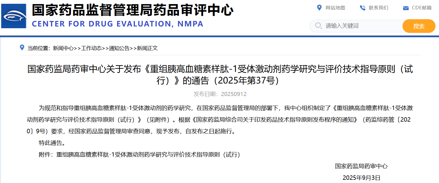 國(guó)家藥監(jiān)局藥審中心關(guān)于發(fā)布《重組胰高血糖素樣肽-1受體激動(dòng)劑藥學(xué)研究與評(píng)價(jià)技術(shù)指導(dǎo)原則(試行)》的通告(2025年第37號(hào))