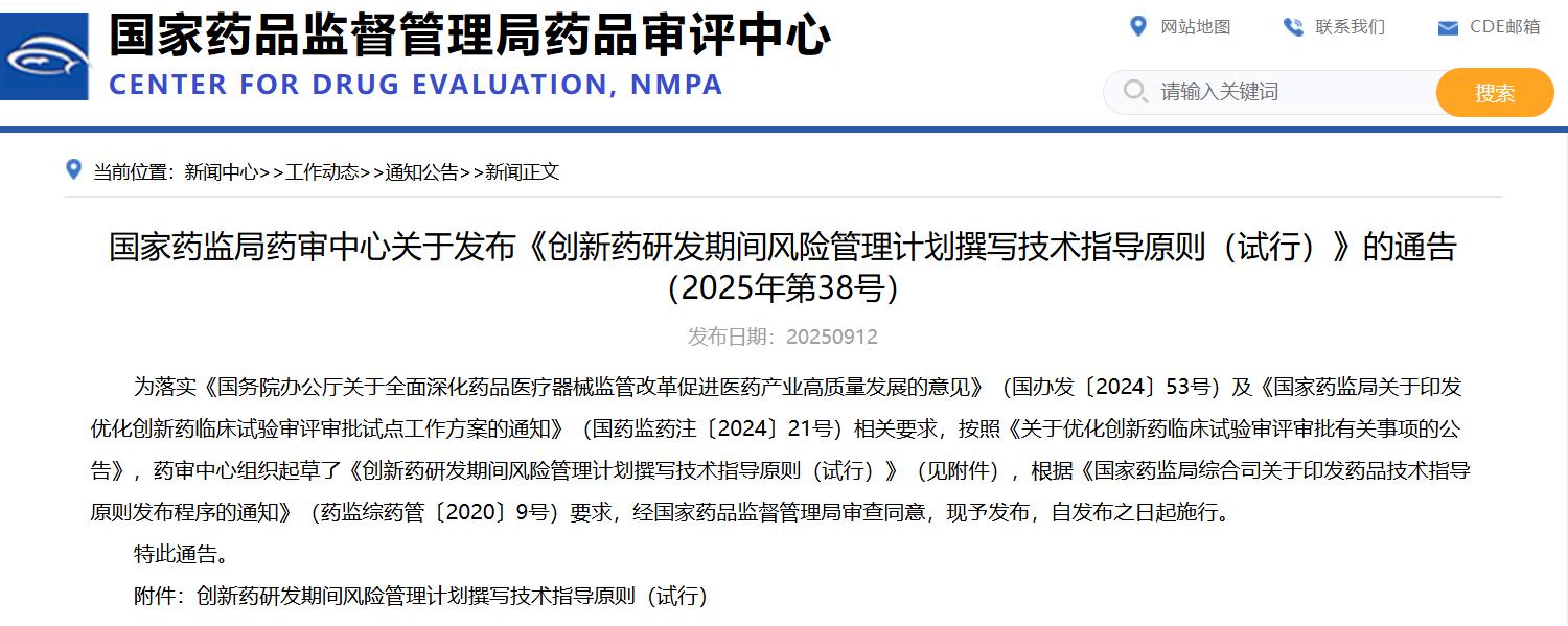 國(guó)家藥監(jiān)局藥審中心關(guān)于發(fā)布《創(chuàng)新藥研發(fā)期間風(fēng)險(xiǎn)管理計(jì)劃撰寫(xiě)技術(shù)指導(dǎo)原則(試行)》的通告(2025年第38號(hào))